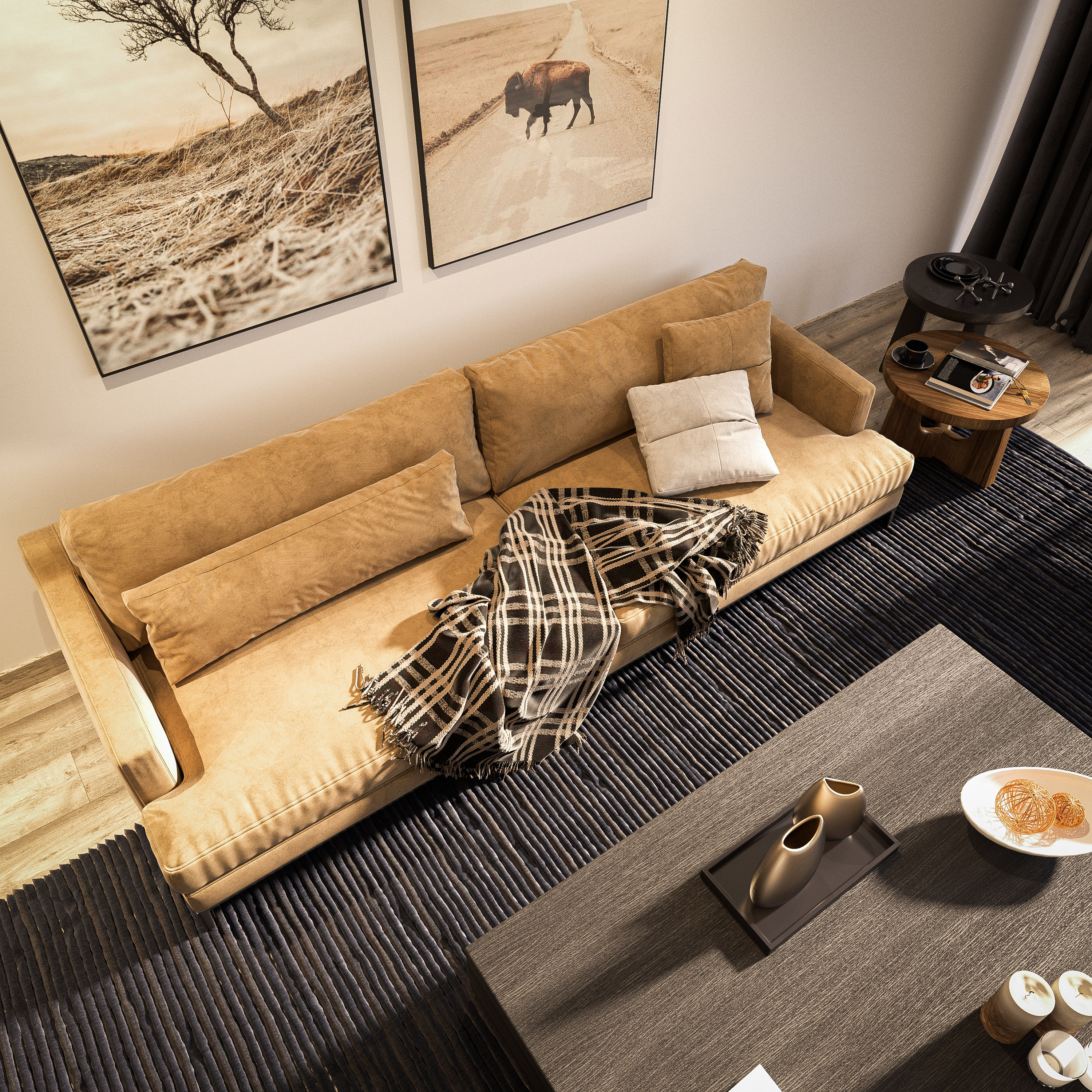 Una propuesta cálida y acogedora, con texturas marcadas y una conexión fluida con el jardín. Para Casa AU, el interiorismo se basó en tonos otoñales y materiales de texturas pronunciadas, generando un ambiente acogedor y sofisticado. A través de los renders, se capturó la esencia del diseño, destacando la riqueza material y la atmósfera de cada espacio con un alto nivel de realismo.